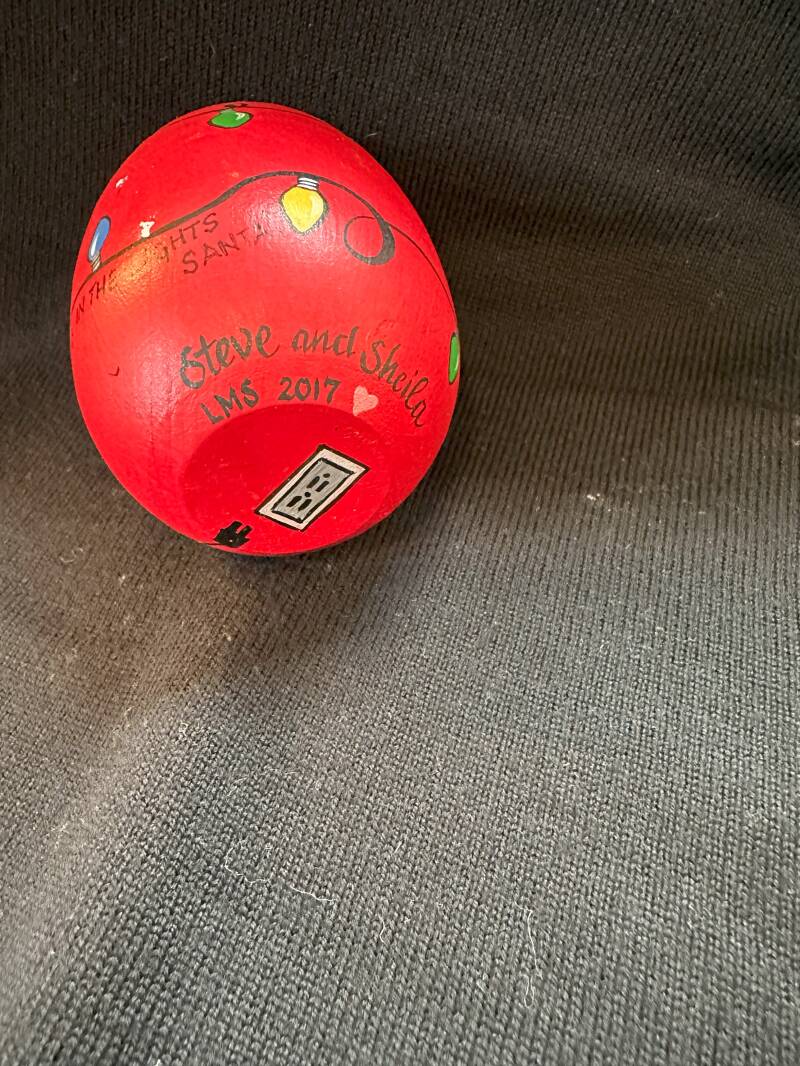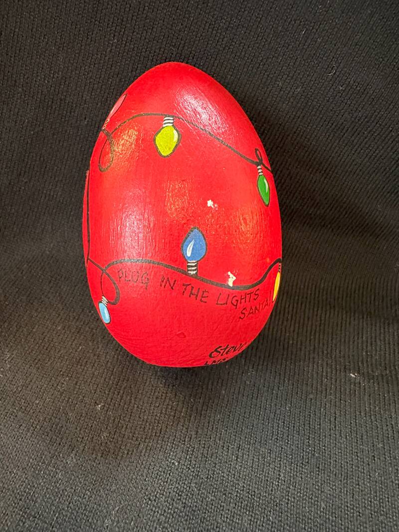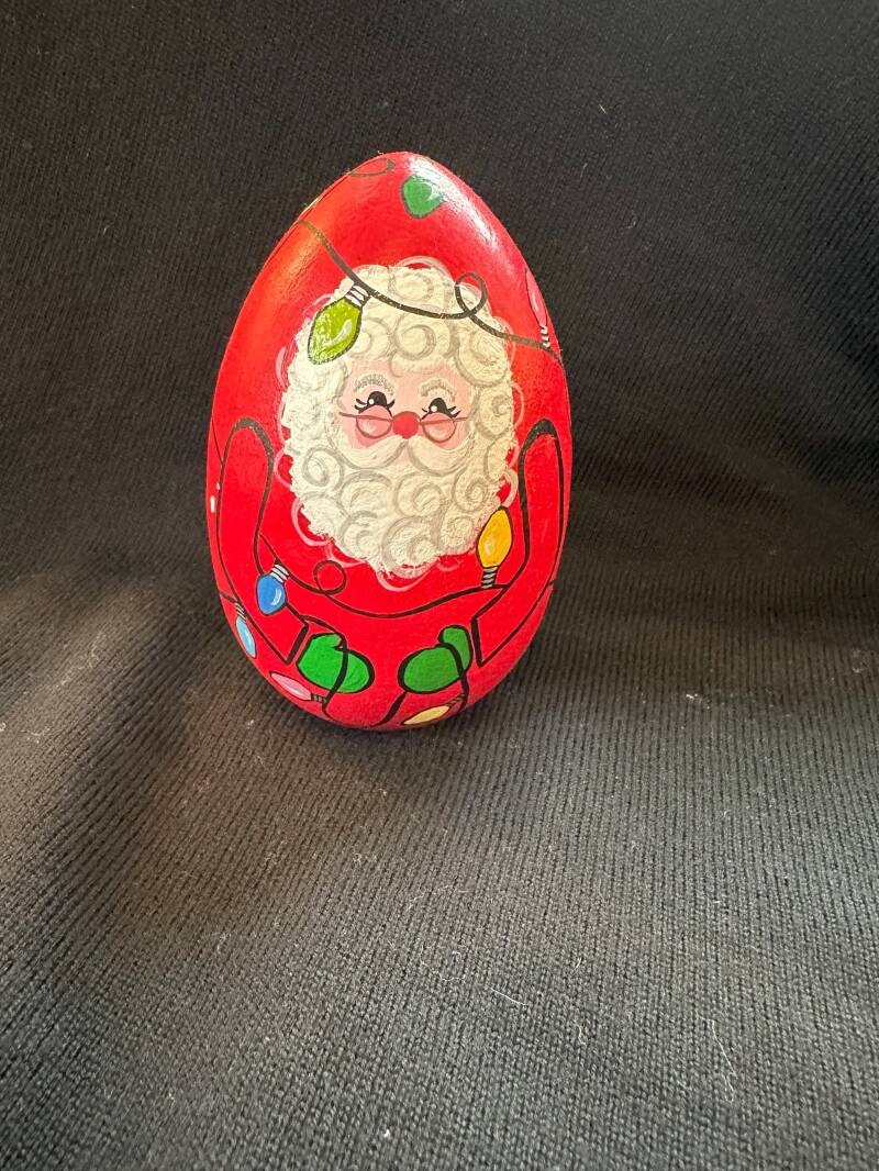 Large wooden egg from a craft store... Santa's holding multi-colored Christmas lights - but the plug and outlet are painted on the bottom. Loved painting those lights!